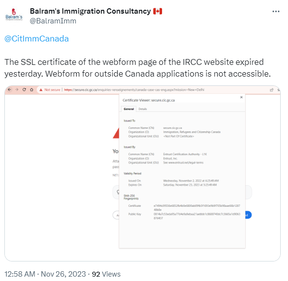 In a recent hiccup, the Immigration, Refugees, and Citizenship Canada (IRCC) webform faced a disruption due to an expired SSL certificate on November 24, 2023. Users were unable to access the webpage, causing inconvenience for immigration applicants.